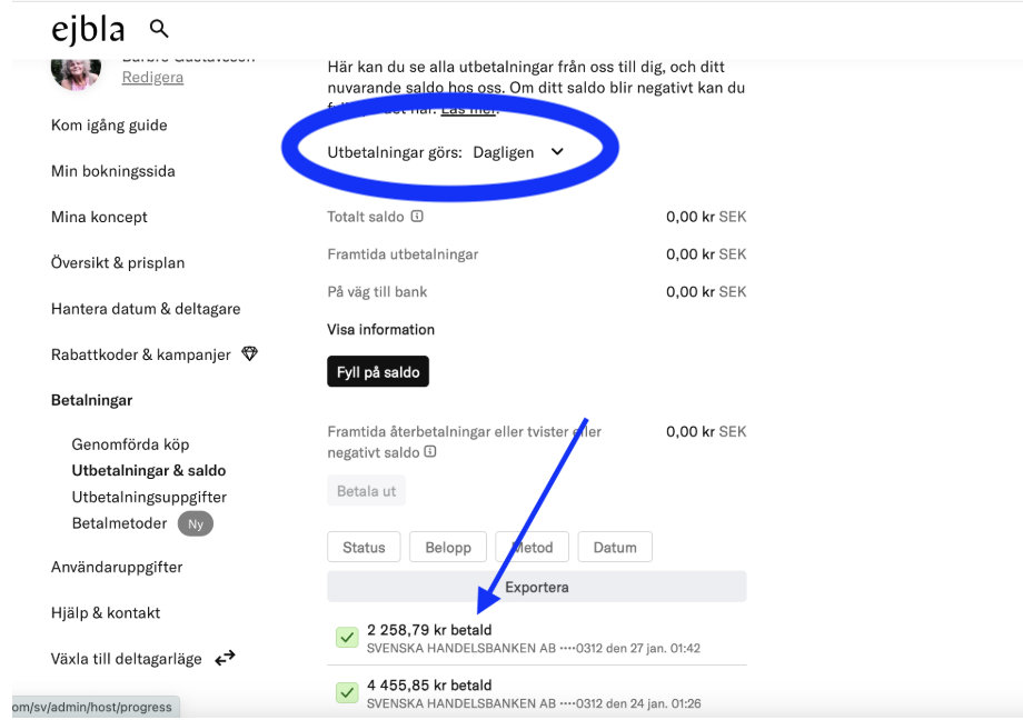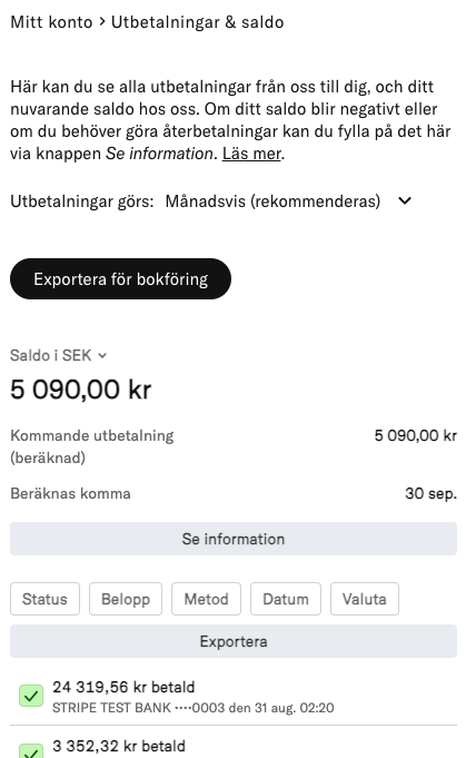 Tips! Välj månadsvis utbetalningar för färre transaktioner att bokföra. Detta underlättar även vid eventuella återbetalningar till deltagare.