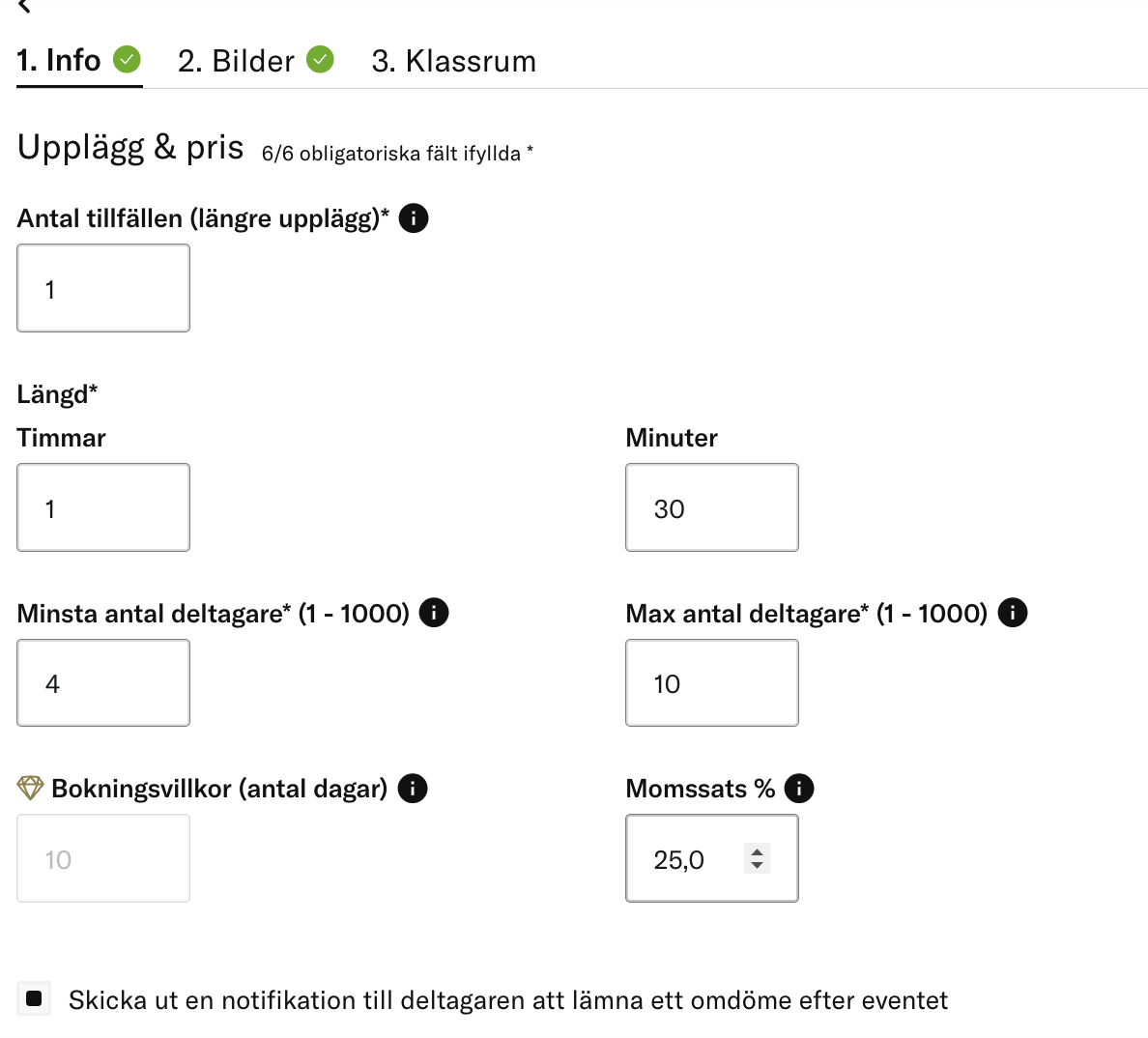 Du väljer på konceptet vilken momssats du vill visa på kvittot för deltagare. Standard är 25% moms på deltagarens kvitto. Du kan alltså ha olika momssatser på olika koncept, du väljer det på "upplägg och pris"