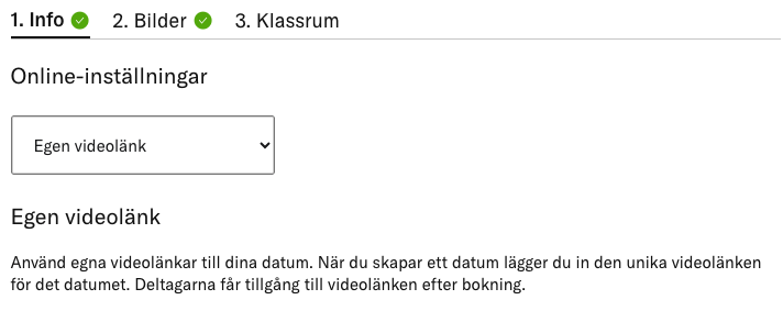 När du sen lägger upp ett datum för konceptet, lägger du in länken till videomötet som du skapat (ex Google Meet eller Zoom Basic).