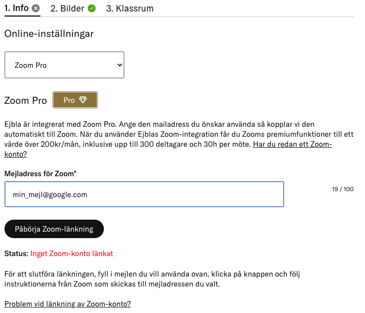 Med Ejbla kan du välja att hålla din kurs på plats eller online. Om du väljer online så kan du välja om du vill använda Ejblas integration med Zoom Pro (kräver prisplanen Pro hos Ejbla) för dina videomöten, eller använda din egna videolänk (finns för alla prisplaner).